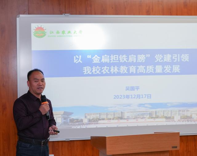 江西农业大学教务处党支部书记、教务处处长吴国平以《以“金扁担铁肩膀”党建引领我校农林教育高质量发展》为题作专题报告。报告分别从新时代赋予农林教育新使命、农林教育拔尖创新人才培养面临新挑战、拔尖创新人才自主培养的“江农”探索与实践3个方面进行阐述,提出农林教育要主动服务于国家战略需求,要加快拔尖创新人才的自主培养。