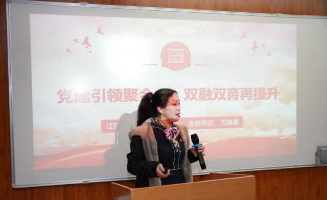 江西财经大学教务处党支部书记、教务处处长万建香以《党建引领聚合力,双融双育再提升》为题作专题报告。报告从始终把党的政治建设摆在首位、高质量推进主题教育、意识形态工作与党建有机融合、积极开展“双融双育”活动、2024年党建工作思路和措施等五个方面详细阐述了江西财经大学教务处党支部党建引领中心工作的举措。