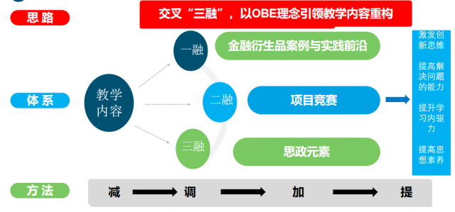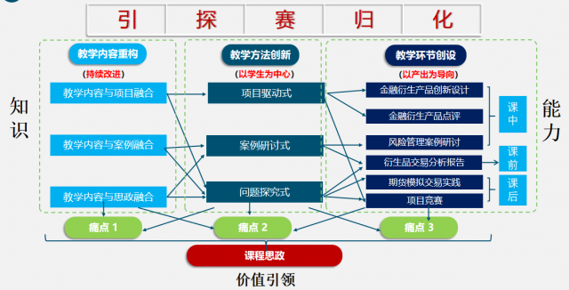 传统金融工程教学重视理论的系统性、知识的连贯性、但忽视了学生的创新意识和解决问题能力的培养。授课过程大多采用灌输式教学,忽略了实践化教学和特色化教学,导致学生对于运用金融工程理论和思维解决金融实际问题的能力较弱,难以激发学生的创新精神、质疑批判精神。因此本课程以经典金融衍生产品评点和金融衍生产品创新设计为驱动开展教学,加强师生、生生之间的互动,着重培养学生的创新思维和创新精神;以“郑商所杯”全国大学生金融模拟交易大赛、“工行杯”金融科技创新大赛等赛事为依托,进行课外拓展、以赛促学,提高学生综合运用所学知识解决金融实际问题的能力,打通学生所教与所需难以同步的“痛点”。