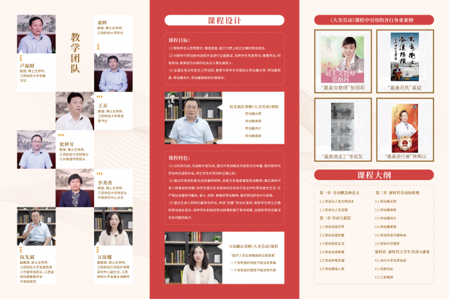 《大美劳动》慕课是我校精心打造的国内高校首门劳动教育慕课,于2020年10月在智慧树平台上线。慕课以生动的劳动教育案例,多层次多角度展现劳动精神,礼赞劳动创造,讴歌劳模精神、工匠精神、创新创业精神,引导树立劳动最光荣、劳动最崇高、劳动最伟大、劳动最美丽的价值观念。校党委书记卢福财、校长邓辉、原校党委书记王乔等担任主讲教师。截止2021年12月,大美劳动慕课累计选课人数已达33.85万人,累计选课学校217所,慕课平台累计互动213.08万余人次,具有广泛的社会影响。